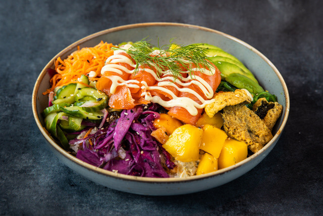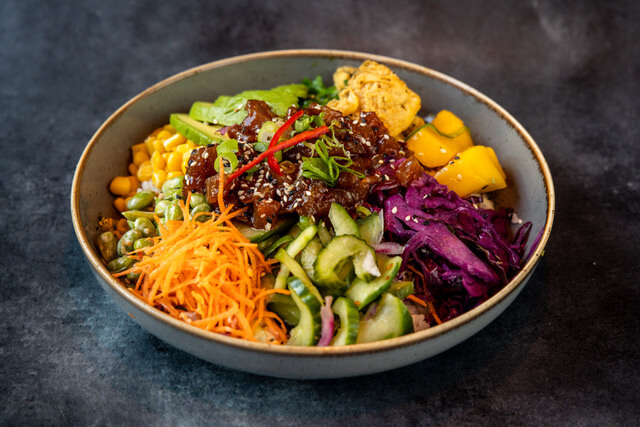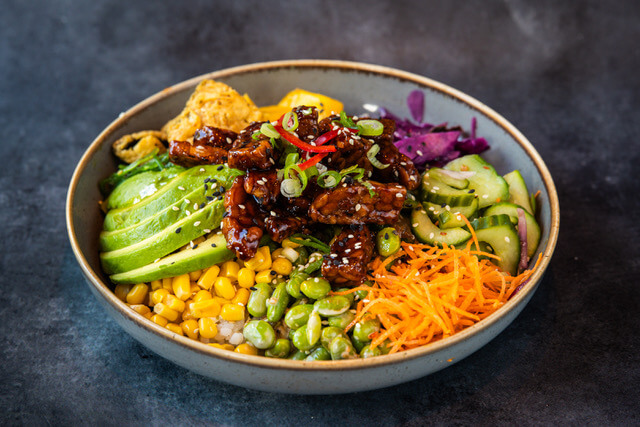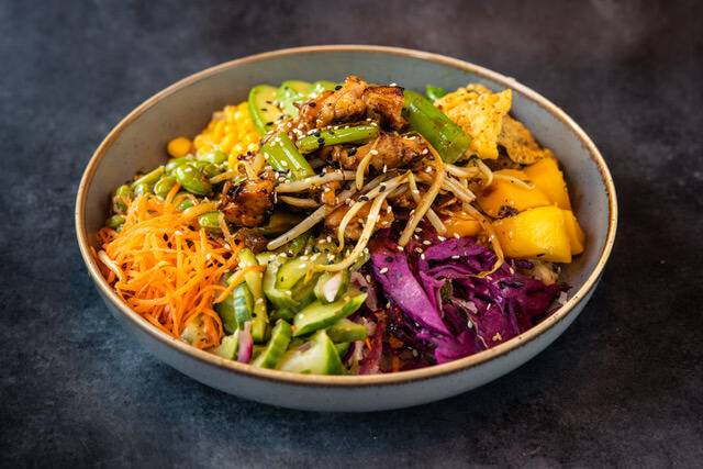 Salad Bowl With Pulled Chicken, Marinated Veggies, Avocado & Yoghurt Cumin Dressing