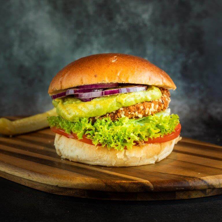 Veggie Burger Maade Of Fresh Veggies, Quinoa and Chickpeas, Served On A Brioche Bun And Served With Guacamole